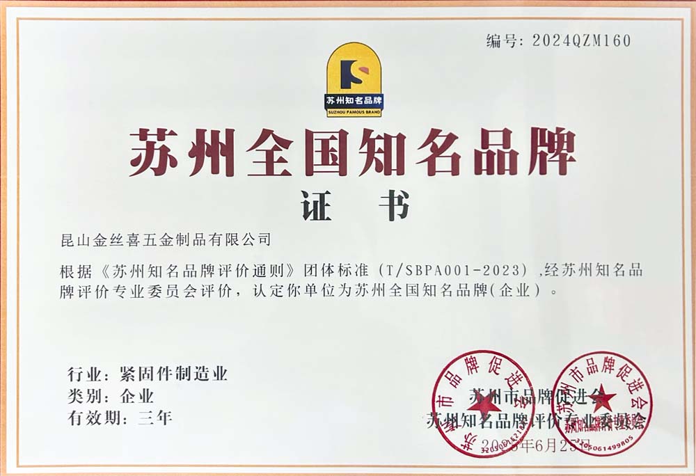 KunshanjinsixiMetalware Co. , Ltd. ได้รับรางวัลอย่างเป็นทางการชื่อ "แบรนด์ที่มีชื่อเสียงแห่งชาติในซูโจว" สำหรับคุณภาพผลิตภัณฑ์ที่ยอดเยี่ยมความแข็งแกร่งทางเทคโนโลยีชั้นนำระบบบริการที่ครอบคลุมและอิทธิพลของตลาดอย่างกว้างขวาง!